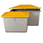 Dank seines auffälligen orangefarbenen Scharnierdeckels bleibt der Behälter auch bei Schnee gut sichtbar. Mit einem Volumen von 550 Litern bietet er ausreichend Platz für Streusalz, Sand oder Splitt.
