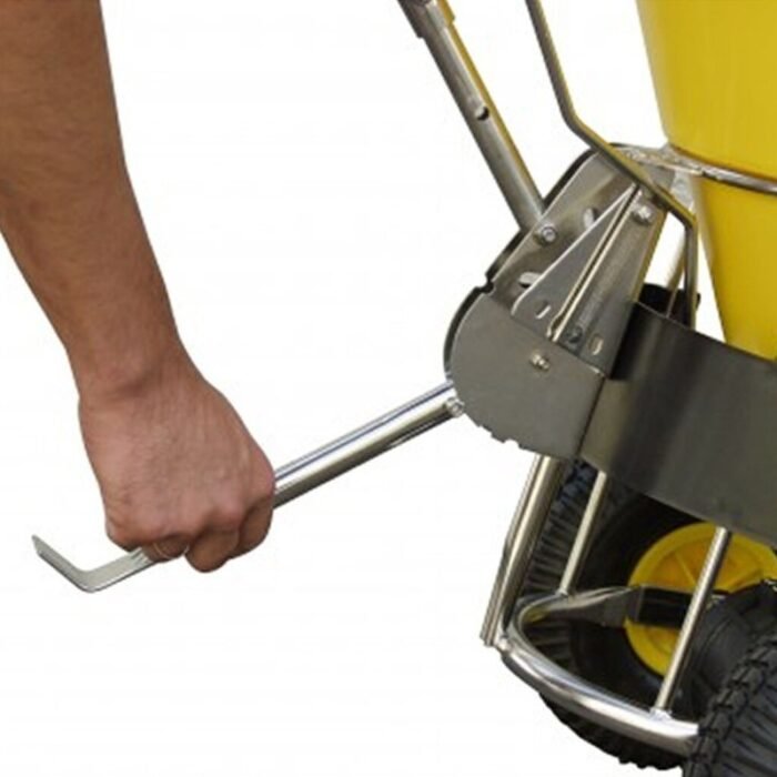 Dank der einstellbaren Streumenge mit Anschlag kann die Dosierung präzise angepasst werden. Der robuste Aufbau mit Composite-Rahmen, PE-Behälter, Edelstahlachsen und Winterprofil-Gummireifen garantiert maximale Langlebigkeit und Zuverlässigkeit im täglichen Einsatz.