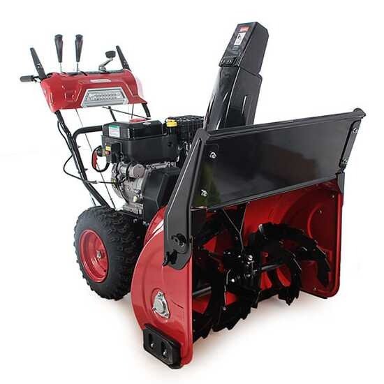 Die große Schnecke aus emailliertem Stahl misst 76 cm Breite und 54 cm Höhe und besitzt einen Durchmesser von 32 cm. Sie zerkleinert und wirft den Schnee über eine um 190° drehbare Stahlwurfglocke bis zu 15 Meter weit aus. Das zweistufige System ermöglicht eine schnelle und kraftvolle Schneeräumung.